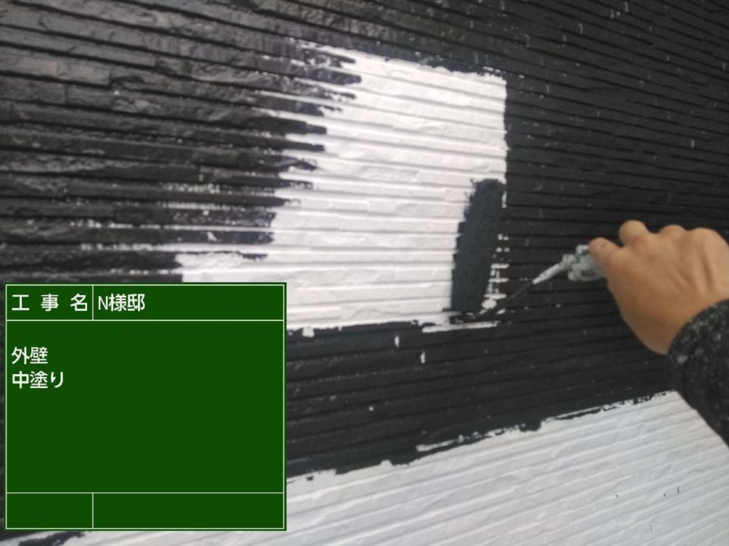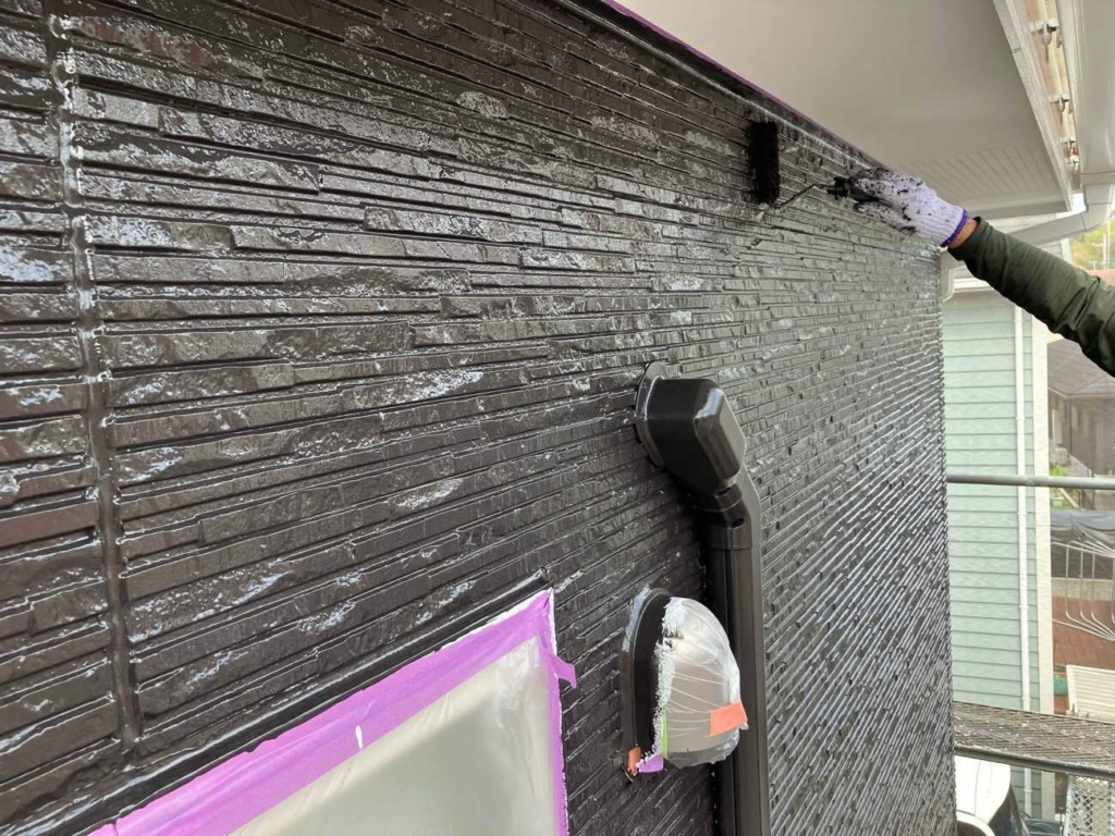 外壁中塗り 中塗りは無機塗料のグランセラトップ1液水性、色はお好みの色にオーダーして頂きました