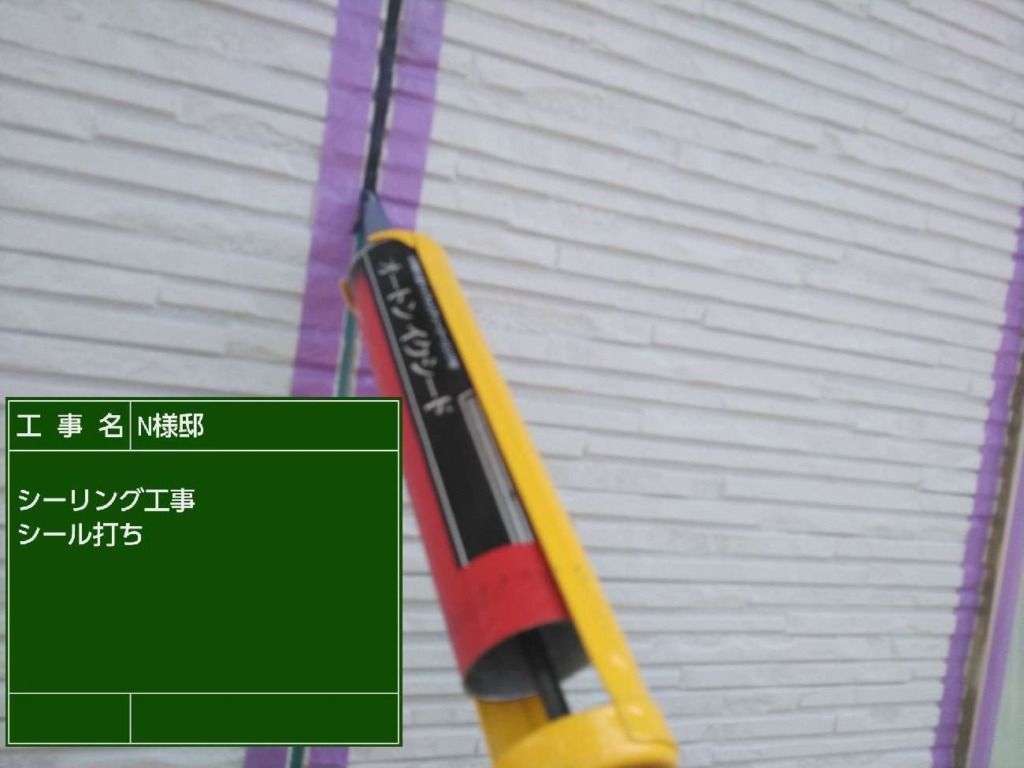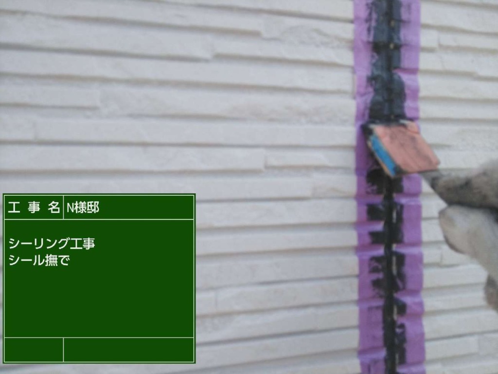 シーリング材充填 外壁共色のシーリング材が無いので、先打ちして養生期間をおきます