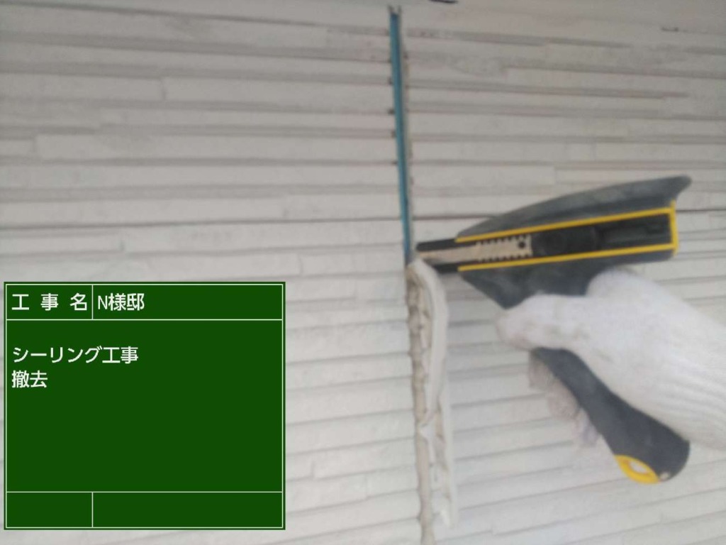 目地シーリング撤去 外壁目地のシーリングをカッターで撤去します