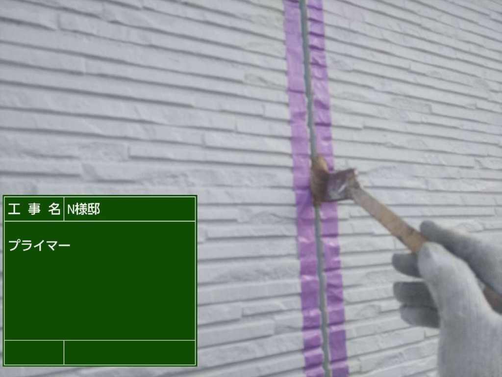 プライマー塗布 シーリング材の密着を高めるプライマーを塗っています