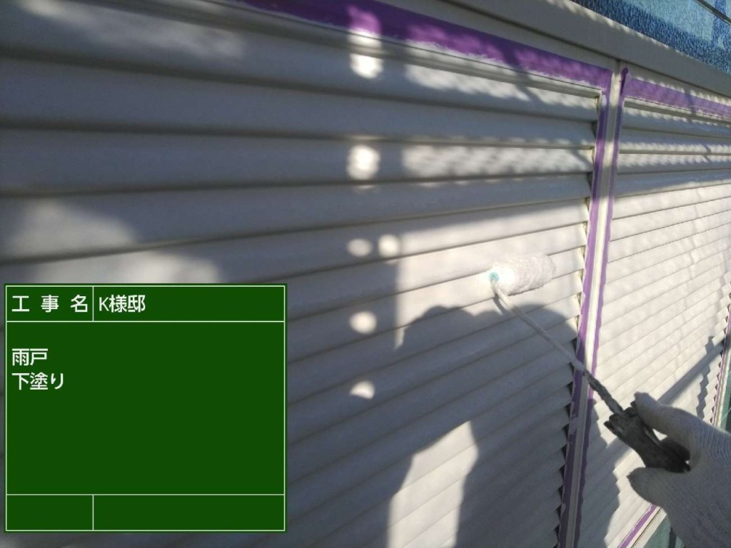 付帯部塗装 雨戸下塗り 鉄部の下塗りは錆止め入りの下塗り材を使用します